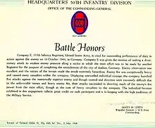 In a letter to the 30th Division commander in May 1946, the Supreme Allied Headquarters Army Historian Colonel S.L.A. Marshall called the 30th Infantry Division the "Finest Infantry Division in the European Theater of Operations". Marshall wrote, "It is the combined judgments of the approximately 35 historical officers who had worked on the records and in the field that the 30th merited this distinction. It was our finding that the 30th had been outstanding in three operations and we could consistently recommend it for citation on any of these occasions. It was further found that it had in no single instance performed discreditably or weakly ... and in no single operation had it carried less than its share of the burden or looked bad when compared to the forces on its flanks. We were especially impressed with the fact that it consistently achieved results without undue wastage of its men."[3]