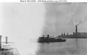 Shada was built as a private motorboat of the same name in 1908 by George Lawley & Son at Neponset, Massachusetts. On either 3[5] or 28[6] April 1917, her owner, Mrs. G. W. Sortwell of Boston, Massachusetts, loaned her to the U.S. Navy for use as a section patrol vessel during World War I. She was commissioned on either 3 April[7] or 22 May[8] 1917 as USS Shada (SP-580).