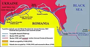 The border is mostly inherited from the Romania–Soviet Union border,[1] with some border disputes, most notable being the Snake Island issue. On 4 July 2003 the President of Romania Ion Iliescu and the President of Russia Vladimir Putin signed a treaty about friendship and cooperation. Romania promised not to contest territories of Ukraine or Moldova, which it lost to Soviet Union after World War II, but requested that Russia as a successor of the Soviet Union recognized its responsibility in some form for what had happened.[2]