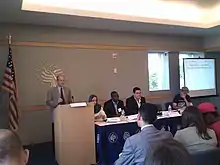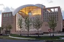 In March 2011, USIP moved into its permanent headquarters facility at the northwest corner of the National Mall in Washington, D.C. Designed by Moshe Safdie Architects and Buro Happold, the LEED-certified building aims to serve as a symbol of America's commitment to peacebuilding. The building houses offices and staff support facilities, a library, a conference center, auditorium, classrooms, and a public education center.[36] Officials broke ground for the new headquarters in June 2008 at a ceremony that included President George W. Bush, Senate majority leader Harry Reid, and Speaker of the House Nancy Pelosi.[37]
