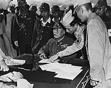 Nisei from the MIS parachuted down into Japanese POW prison camps at Hankow, Mukden, Peiping and Hainan as interpreters on mercy missions to liberate American and other Allied prisoners.[20] Arthur T. Morimitsu was the only MIS member in the detachment commanded by Major Richard Irby and 1st Lt. Jeffrey Smith to observe the surrender ceremony of 60,000 Japanese troops under Gen. Shimada.[21] Kan Tagami witnessed Japanese forces surrender to the British in Malaya.[22]