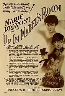 Up in Mabel's Room is a 1926 American silent comedy film directed by E. Mason Hopper and starring Marie Prevost and Harrison Ford. It is based on the 1919 play of the same name by Wilson Collison and Otto Harbach.[1]