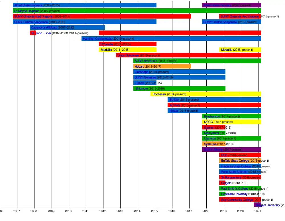 Niagara UniversityErie Community CollegeCastleton UniversityPaul Smith's CollegeColgate UniversitySt Bonaventure UniversityPenn State BehrendSUNY FredoniaBuffalo State CollegeErie Community CollegeSUNY AlbanySyracuse UniversityClarkson UniversityMercyhurst UniversityGannon UniversityNiagara County Community CollegeBinghamton UniversityIthaca CollegeAlbany College of Pharmacy and Health SciencesUniversity at BuffaloUniversity of RochesterSkidmore CollegeHilbert CollegeSUNY GeneseoOnondaga Community CollegeHobart and William Smith CollegesSUNY BrockportUnion DutchmenMedaille CollegeMedaille CollegeD'Youville UniversityHamilton ContinentalsSt. John Fisher UniversityCazenovia WildcatsSUNY Canton KangaroosSUNY Canton KangaroosSUNY Oneonta Red DragonsSUNY Oneonta Red DragonsLe Moyne DolphinsAlfred State PioneersAlfred State Pioneers
