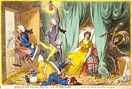 In Britannia between Death and the Doctor's (1804), James Gillray caricatured Pitt as a doctor kicking Addington (the previous doctor) out of Britannia's sickroom.