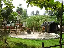 [1] Village life of yesteryear North Karnataka is showcased at Utsav Art Garden. Along with murals related to Agriculture, various Artisans of Villages like Weavers, Handicraft workers, Lambani Artists and such are placed at the Garden. There's a small lake, with Boat-Rides. Food options include the local flavor of Jowar Roti,palya, assortment of chutney powders, curds, bhutti, holige and other Indian varieties.