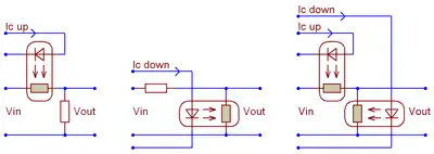 Circuits with defined control voltage of the divider can compensate for the thermal drift of the LED in a RO,[74] but not for the memory effect and thermal drift of the photoresistor. The latter compensation requires a second (reference) photoresistor, which is illuminated by the same light intensity, at the same temperature as the main (modulating) device.[75] Best compensation is achieved when both photoresistors are formed on the same semiconductor chip. The reference photoresistor is included in a divider of stabilized voltage or in a measuring bridge. The error amplifier compares the voltage at the middle point of the divider with the target value and adjusts the controlling current. In the linear controlling regime the RO becomes an analog multiplier: the current through the photoresistor is proportional to the product of the voltage across the photoresistor and the control voltage.[76][77]