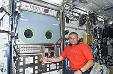Valeri Korzun with the Microgravity Science Glovebox following its installation in the Destiny Laboratory module of the ISS.