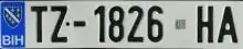 Bosnia and Herzegovina vehicle registration plates have held their current form since 2 February 1998.[1] Currently the Bosnia and Herzegovina (BiH) vehicle registration plate format consists of seven characters: five numbers and two letters arranged in the following order: X00-X-000 (taxis: TA-000000). The plates are uniform across the country and do not denote the place (town, municipality, canton, or entity) where the vehicle is registered, as was the case prior to 1998. Likewise the plates do not contain any heraldic symbols. The plates use only letters which are represented equally in Latin and Cyrillic script (A, E, O, J, K, M, T).
