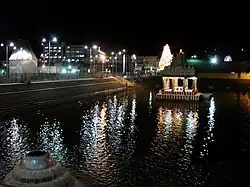 Tirumala Hills are part of Seshachalam Hills range. The hills are 853 metres (2,799 ft) above sea level and comprise seven peaks, representing the seven heads of Adisesha. The temple lies on the seventh peak—Venkatadri, on the southern banks of Sri Swami Pushkarini, a holy water tank. Hence the temple is also referred to as "Temple of Seven Hills".[4] Tirumala town covers an area of about 10.33 sq mi (26.75 km2).