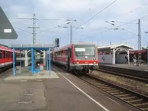 Wörth (Rhein) station—originally Wörth (Pfalz)[5][6]—is the most important station of the town of Wörth am Rhein in the German state of Rhineland-Palatinate. Deutsche Bahn classifies it as a category 5 station and it has five platforms. The station is located in the area of the Karlsruher Verkehrsverbund (Karlsruhe transport association, KVV) and it belongs to fare zone 540.[7] Since 2001, Verkehrsverbund Rhein-Neckar (VRN) tickets are also accepted for travel to or from the VRN area. The address of the station is Bahnhofstraße 44.[8]