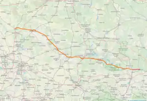 Węgliniec–Roßlau railway with a short section in Western Poland (red) and a longer section in Southeastern Germany (orange)