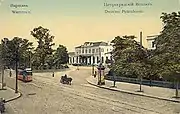 The Petersburg Train Station (Polish: Dworzec Petersburski) was built in 1863 as the final terminus of a new railroad linking Warsaw with Vilnius and St. Petersburg. The building itself was designed by Narcyz Zborzewski. As the line used Russian gauge while another major railway line operating in Warsaw at the time (namely the Warsaw–Vienna Railway) used Standard gauge, the two could not have been connected. To allow passengers travelling from Vienna to St. Petersburg easier access to both terminals a horse-drawn tramway line was opened soon after the railway line's completion, thus giving birth to Warsaw's tramway network. The original train station had been blown up by withdrawing Russian troops in 1915 during World War I.