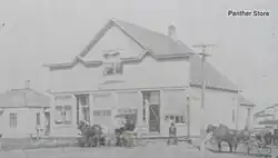 About 1934 John and Mart Sheaffer bought up all of the Co-operative association and became full owners of Panther Store. Rooms above the store, served as living quarters for the manager. The store became a popular place for farmers to congregate. On Saturday afternoons and on rainy days, the hitching racks filled up with teams as folks came for supplies. They bought groceries, dry goods, shoes, tobacco, kerosene, men's overalls and shirts, mittens, canned goods, shucking pegs, ammunition, and candy. Panther served as a produce store, buying poultry, eggs, cream, and butter. They took orders for buggy's, wagons, a variety of farm machinery, fencing materials, and furniture. These orders were shipped to Dallas Center and then hauled out by teams. When cars and trucks came more into use, they were used, instead of horse-drawn wagons to bring supplies from Des Moines. Motorized travel made it necessary to install a gasoline pump.[2]