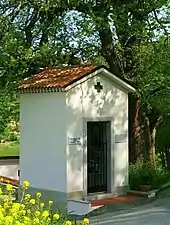 Chapel-shrines, built to resemble a small building, are common in Slovenia. They are generally too small to accommodate people and often have only a niche (occasionally, a small altar) to display a depiction of a saint. The main two varieties generally distinguished in Slovenia are the open chapel-shrine (Slovene: kapelica odprtega tipa, odprti tip kapelice), which has no doors, and the closed chapel-shrine (kapelica zaprtega tipa, zaprti tip kapelice), which has a door.[6] The closed chapel-shrine is the older form, with examples known from the 17th century onward. The earliest open chapel-shrines date from the 19th century.[7] Also known in Slovenia are the belfry chapel-shrine (kapelica - zvonik) and the polygonal chapel-shrine (poligonalna kapelica).[8]