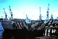 Harrier GR.3 undergoing an engine change in the hangar deck on HMS Hermes. A Fleet Air Arm Lynx is visible at the rear of the hangar.