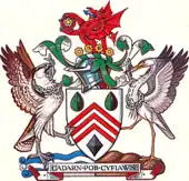 The arms of West Glamorgan were: Argent three chevronels gules, between in chief two pine cones vert dimidiating as many gouttes sable, and in base a lozenge sable. The crest is a Welsh Dragon holding a Tudor rose in its forepaws, rising above four gold cogwheels. The supporters are an osprey and a heron, both with a fish in their beaks, and wearing a chain round their necks. The osprey is standing on water, and the heron on a ploughed field. The motto is Cadarn pob cyfiawn (Welsh: 'The just are strong'). The chevronels derive from the arms of the de Clare family; the pine cones represent forestry; the black drops (gouttes) the oil industry; and the black lozenge, coal. The four cogwheels above the shield stand for the four districts and their industries; the chains around the supporters' necks, the steel and aluminium industries; the water and the fish, fishing; and the ploughed field, agriculture.[2]