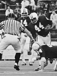 Following the 1965 season, Jim Carlen took over for Corum as head coach. After a 3–5–2 finish in 1966, Carlen guided the Mountaineers to their 8th and final SoCon championship in 1967.[26] West Virginia left the Southern Conference thereafter, participating as an independent until 1991. Carlen's Mountaineers would produce subsequent winning seasons in 1968 and 1969, posting records of 7–3 and 10–1, respectively. The 1969 edition of the Mountaineers was the most successful West Virginia team since the 1922 season.[4] Not only did the Mountaineers win 10 games, but they earned their first bowl game victory since 1948 with a Peach Bowl victory over No. 19 South Carolina, as well as a No. 18 final ranking in the Coaches Poll. The dynamic rushing tandem of running back Bob Gresham (1,155 yards and 9 touchdowns) and fullback Jim Braxton (843 yards, 12 touchdowns) led the Mountaineers.[27] Gresham became the second Mountaineer to ever rush for more than 1,000 yards (Garrett Ford, Sr. was the first with 1,068 yards in 1966).[28] At the conclusion of the 1969 season, Carlen departed West Virginia for Texas Tech. The Mountaineers responded by hiring Bobby Bowden.