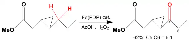 The reaction selectivity is highly influenced by electronics due to the highly electron withdrawing ester group present in the substrate. For that reason the reaction proceeds with oxidation at the tertiary C–H bond most remote from the ester with reaction yields of greater than 50% and selectivities of >99:1.[5] Electronically guided site-selectivity is also observed for secondary sites, affording yields of mono-oxidized products of 50% or greater.[6]
