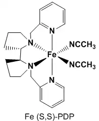 The White–Chen catalyst is an Iron-based coordination complex named after Professor M. Christina White and her graduate student Mark S. Chen. The catalyst is used along with hydrogen peroxide and acetic acid additive to oxidize aliphatic sp3 C-H bonds in organic synthesis. The catalyst is the first to allow for preparative and predictable aliphatic C–H oxidations over a broad range of organic substrates.[1][2][3][4] Oxidations with the catalyst have proven to be remarkably predictable based on sterics, electronics, and stereoelectronics allowing for aliphatic C–H bonds to be thought of as a functional group in the streamlining of organic synthesis.