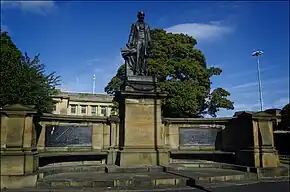 Armstrong donated the long wooded gorge of Jesmond Dene to the people of the city of Newcastle upon Tyne in 1883, as well as Armstrong Bridge and Armstrong Park nearby.[18] He was involved in the foundation in 1871 of the College of Physical Science [19] - a forerunner of the University of Newcastle, renamed Armstrong College in 1906. He was President of the Literary and Philosophical Society of Newcastle upon Tyne from 1860 until his death, as well as twice president of the Institution of Mechanical Engineers. Armstrong gave £11,500 towards the building of Newcastle's Hancock Natural History Museum, which was completed in 1882. This sum is equivalent to over £555,000 in 2010. Lord Armstrong's generosity extended beyond his death. In 1901 his heir, William Watson-Armstrong gave £100,000 (equivalent to £11,549,873 in 2021),[20] for the building of the new Royal Victoria Infirmary in Newcastle upon Tyne. Its original 1753 building at Forth Banks near the River Tyne was inadequate and impossible to expand.[2] In 1903 the barony of Armstrong was revived in favour of William Watson-Armstrong.