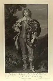 A portrait of Grandison survived at Lydiard House, his mother's family home in Wiltshire, as of 2006. It is catalogued as by the school of Anthony van Dyck. At the bottom right of the canvas is the name "LD. GRANDISSON".[14][15] This painting was engraved about 1714 by Pieter van Gunst, who identified it as "William Villiers, Vicount Grandisson, Father to ye Late Duchesse of Cleaveland", with the attribution "A v. Dyk pinx".[16] Theresa Lewis, in her Lives of the Friends and Contemporaries of Lord Chancellor Clarendon (1852), gives an unmistakable description of this portrait and reports that two copies of it then existed, one owned by the Duke of Grafton, a direct descendant of Grandison's, and the other by Earl Fitzwilliam.[17]
