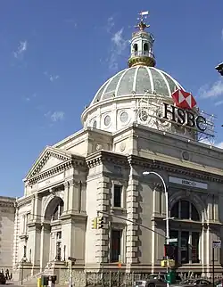 The bank building is a Classical Revival structure designed by George B. Post and erected in 1875 for the Williamsburgh Savings Bank.[3][6] The edifice is four stories high with a domed roof.[7][8] The building blends Roman and Renaissance classical elements, a style that only became popularized two decades after the structure was completed.[6] The current configuration of the building dates to a major expansion in 1906; minor modifications were also made in 1923 and 1941–1942.[8][9] The firm of Helmle, Huberty & Hudswell designed the 1900s and 1920s additions.[10]