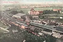 - Salisbury; originally with over-all roof; LSWR station subsequently built adjacent; closed to passengers 1932.
