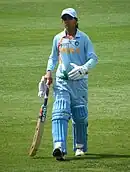 A member of the India team at the 2009 Women's Cricket World Cup. She wears the same trousers, long sleeve shirt and cap as the men's uniform.