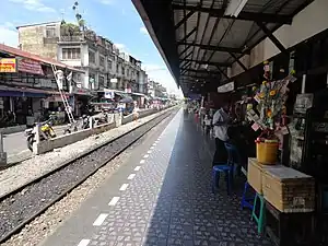 Wongwian Yai railway station is a railway station located in Bang Yi Ruea subdistrict, Thon Buri district, Bangkok. It is a class 1 railway station and is the Bangkok terminus of the Maeklong Railway Mahachai Line. Currently, 34 rail services operate at the station.[1][2] It is located closer to Wongwian Yai roundabout and is in a different location to Wongwian Yai BTS station. Wongwian Yai is the main station used for rail passenger traffic from Samut Sakhon and Samut Songkhram provinces.[3] It is the only railway station terminus with a single track in Thailand.