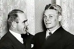 Estonians August Neo (left) and Kristjan Palusalu won medals in both wrestling styles at the 1936 Olympics