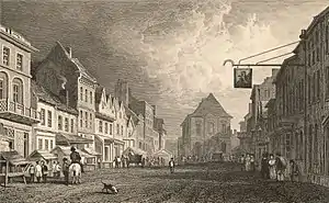 High Street is notable for its grand 18th and 19th century properties of varying scale, colour and detail which were built on long, narrow burgage plots probably of medieval origin.[61] The 18th century façade of the Wynnstay Hotel on Yorke Street closes the vista down the High Street. The hotel is notable as the birthplace of the Football Association of Wales, which was formed at a meeting in the hotel in 1876.[64] The Golden Lion Pub on the High Street is of 16th century origin[62] and became an inn c.1700.[10] The listed Border Brewery chimney towers over Tuttle Street and forms a local landmark in the city centre.