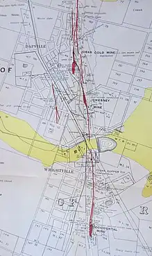 On the eastern edge of the village, toward its southern end, was the Occidental Gold Mine (later the New Occidental Gold Mine),[2][3] and to the village's north-east, the Chesney Mine.[4] Less well known mines in the area were the Gladstone Mine (a copper mine, opened c.1909),[5] in the north-west of the village,[6] Mount Pleasant Mine, just east of the village,[7] and the Young Australian Mine, also just east of the village but a little further south.[8] The irregular shape of the village's ground plan was defined, in a large part, by the presence of these five mine sites, which constrained where the village could be located.[2][9]