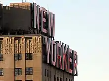 The western facade contains a sign with the name "New Yorker" in 21 ft-high (6.4 m) capital letters.[12][13] The original sign was illuminated from 1941 to 1967.[13] The sign was dark until 2005, when it was replaced with an LED sign[14][15] manufactured by LED Solution of Kitchener, Ontario.[13] The sign can be seen from northern New Jersey, across the Hudson River to the west.[12][16] Each of the letters can be illuminated separately, allowing the sign to display various messages on special occasions such as celebrations.[16]