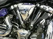 The 1,854 cc (113.1 cubic inches) four-stroke, air-cooled, 48 degree V-twin engine was purpose-built to deliver maximum torque at 2,500 rpm in the 55 to 75 mph (90 to 120 km/h) range used for motorcycle cruising. Each cylinder has four pushrod-activated valves and twin spark plugs.[4] To reduce friction, the forged pistons have an Alumite coating and travel in ceramic-composite-coated cylinder bores.[3]