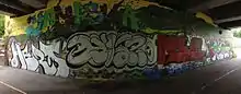 11 May 2013 saw the inauguration of two collective artworks "URGENCE YAMASKA" (Yamaska Emergency) and "LA YAMASKA, C'EST NOUS..." (The Yamaska, it is us...), during the community art project Art-Yamaska; the art is said to be issue of a collective reflection about the river's health and depicts several clear environmental messages. The project aims education of ecological awareness linked to the Yamaska's health. Along with the artwork's public exposition on Granby's water pumping station, the project included poetry reading, a photography exposition, and several mural and mosaic workshops, culminating in festivities on the river's celebration day in 2013. Since their installment, the collective murals have gained much renown and visibility due to their location just off a popular cycling network (a large portion of it within meters of the river). In May 2015, a new artful message followed in the Art-Yamaska project with the creation of "Qu'es-tu devenu Yamaska?" (What have you become, Yamaska?) a few kilometers downstream the same cycling track as the previous mural. Once more, workshops were organized by the art and creativity non-profit organization Atelier 19 to allow a group of youth to invent an environmental message to be posted underneath and on the sides of Patrick-Hackett bridge; the place is famous for its vandalism in the form of graffiti art, the message is thus expressed conjointly and with inspiration from that art movement.[9]