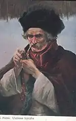 His father's financial affairs worsened, however, and debtors seized their property. Shortly after, his father fled and his mother died, leaving him and his siblings orphaned. He had to work at menial tasks to support himself until 1895, when he found a patron who supplied the funds necessary to enroll at the Academy of Fine Arts, Munich.[1] After graduating, he settled in Lviv, where he soon established himself as a portrait painter and illustrator. In 1901, he took a study trip to Western Europe.