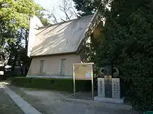 A noted magatama is the Yasakani no Magatama (八尺瓊勾玉, also 八尺瓊曲玉 and 八坂瓊曲玉), one of the three Imperial Regalia of Japan.[36] Swords, mirrors, and jewels were common objects of status for regional rulers in Japan as early as the Yayoi period,[16] and were further widespread in the Kofun period, as shown by their ubiquitous presence in kofun tumuli.[21] The Yasakani no Magatama is stored at the Kashiko-dokoro (賢所), the central shrine of the Three Palace Sanctuaries at the Tokyo Imperial Palace, and is used in the enthronement ceremony of the Emperor of Japan.[36]