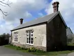 Left: The Schoolhouse, Alwington, erected in 1836 by the widow and sisters of Rev. Thomas Hooper Morrison (1768–1824), as recorded by a stone tablet (right) inscribed: "This building was erected in 1836 by Mrs and the Miss Morrisons with the sanction of the Lord Bishop of Exeter for the education of the children of Alwington parish in the principles of the Established Church"