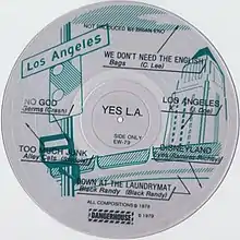 A one-sided picture disc released at the twilight of the early Los Angeles punk scene,[nb 1] Yes L.A. features some of its most acclaimed bands:[1] the Bags, the Eyes, the Alley Cats, Black Randy and the Metrosquad,[3] X, and the Germs.[2]