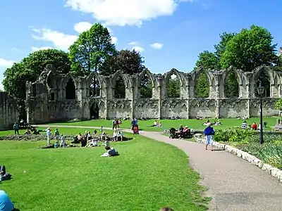York Museum Gardens cover an area of 10 acres (4.0 ha) on the north bank of the River Ouse, just outside the city walls in the centre of York. There are four entrances to the gardens: on Marygate (off Bootham) by St Olave's Church, on Museum Street by Lendal Bridge, via a path at the side of King's Manor, and from the riverside walk next to the River Ouse. The site slopes gently down towards the river and is made up of historical buildings and undulating lawns interspersed with plants and trees. The gardens are open to the public during daylight hours, so the opening and closing times vary throughout the year. Normally admission is free but there are charges for some events.[7] In 2010 it was estimated that the gardens attract 1.3 million visitors a year.[8] Drinking alcohol, cycling and ball games are not allowed in the gardens.