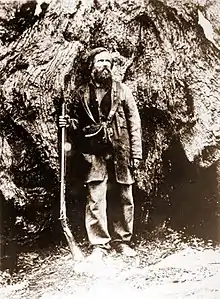The first non-Native Americans to see Yosemite Valley were probably members of the 1833 Joseph Walker Party, which was the first to cross the Sierra Nevada from east to west.[13] The first descriptions of Yosemite, however, came nearly 20 years later. The 1849 California Gold Rush led to conflicts between miners and Native Americans,[14] and the state formed the volunteer Mariposa Battalion as a punitive expedition against the Native Americans living in the Yosemite area. In 1851, the Battalion was led by Major Jim Savage, whose trading post on the Merced River the Awaneechee had raided.[15] This and other missions (the Mariposa Wars) resulted in Chief Teneiya and the Awaneechee spending months on a reservation in the San Joaquin Valley. The band returned the next year to the Valley but took refuge among the Mono Paiutes after further conflicts with miners. Most of the Awaneechee (along with Teneiya) were chased back to the Valley and killed by the Paiutes after violating hospitality by stealing horses.